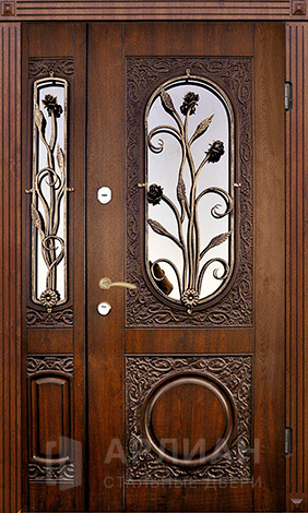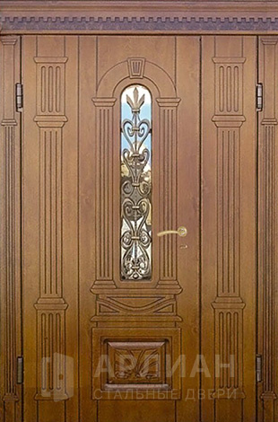 Двухстворчатая входная дверь со стеклом и ковкой №9