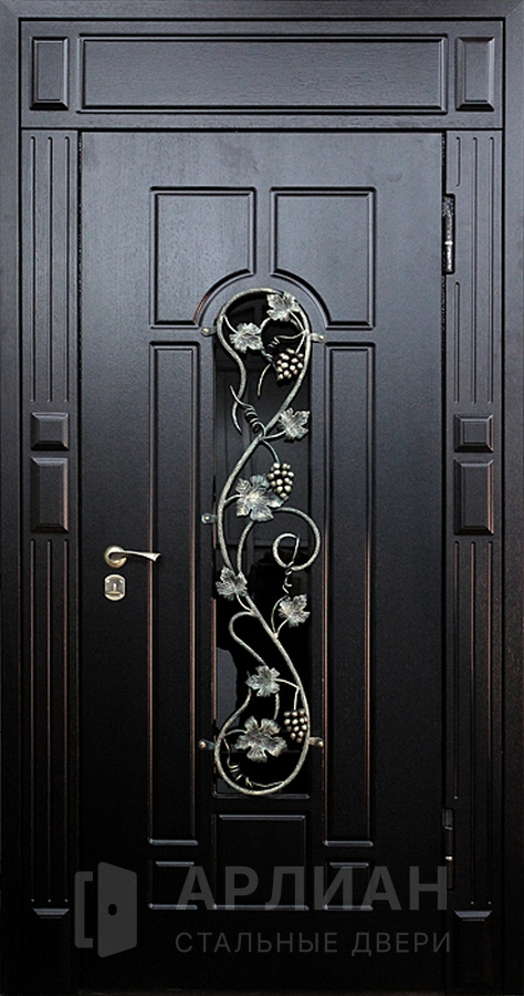 Черная дверь отделка мдф арочная с ковкой и стеклом №53